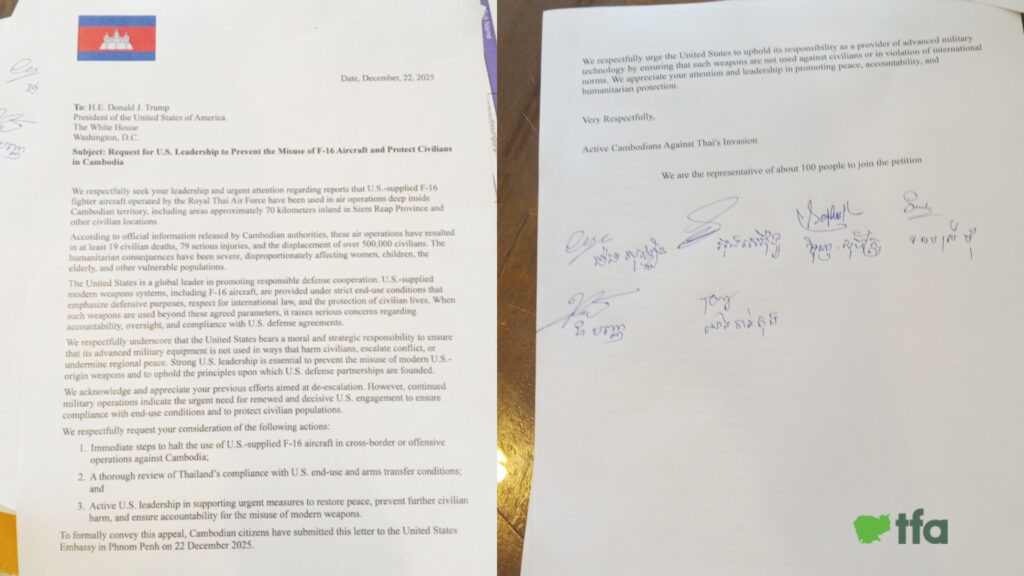 នៅព្រឹកថ្ងៃច័ន្ទ ទី២២ ធ្នូ នេះ ពលរដ្ឋមួយក្រុមដែលមានគ្នាជិត ១០នាក់តំណាងពលរដ្ឋប្រមាណ ១០០នាក់ បានធ្វើញត្តិរួមគ្នា ទាមទារឱ្យសហរដ្ឋអាមេរិកទទួលខុសត្រូវ និងអន្តរាគមន៍ជាបន្ទាន់បញ្ឈប់សកម្មភាពឈ្លានពានរបស់ថៃលើប្រទេសកម្ពុជា និងបញ្ឈប់ការប្រើប្រាស់យន្តហោះចម្បាំង F-16។