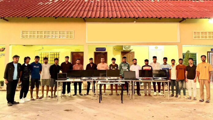 កម្លាំង​សមត្ថកិច្ច​ចម្រុះ​ឃាត់ខ្លួន​ជនសង្ស័យ​ចំនួន​១៩នាក់ ក្នុង​ប្រតិបត្តិការ​ចុះ​ត្រួត​ពិនិត្យ​ឆែកឆេរ ករណី​លបលួច​ប្រព្រឹត្ត​បទល្មើស​ឆបោក​តាម​ប្រព័ន្ធ​បច្ចេកវិទ្យា (Online Scam) នៅ​ចំណុច​ផ្ទះ​វីឡា​ជួល ស្ថិត​នៅ​ភូមិ​សាលាកំរើក សង្កាត់​សាលាកំរើក ក្រុង​សៀមរាប កាល​ពី​ថ្ងៃ​ទី២ ធ្នូ ២០២៥។ រូប៖ ទទក