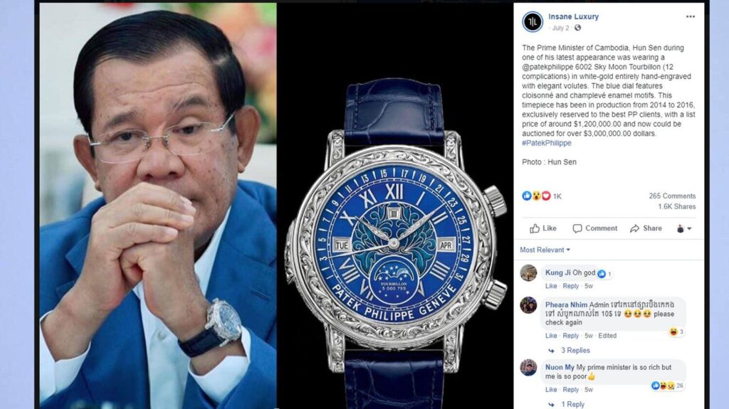 ទំព័រ​ហ្វេសប៊ុក​ឈ្មោះ Insane Luxury ចុះ​ផ្សាយ​អំពី​នាឡិកា​លោក ហ៊ុន សែន ពាក់ ដែល​មាន​តម្លៃ​រាប់​លាន​ដុល្លារ។ រូប៖ ហ្វេសប៊ុក​ឈ្មោះ Insane Luxury