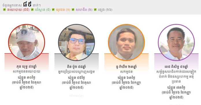អង្គការ​សម្ព័ន្ធ​ខ្មែរ​ជំរឿន និង​ការពារ​សិទ្ធិមនុស្ស​ហៅ​កាត់​ថា លីកាដូ (Licadho) បាន​ផ្សព្វផ្សាយ​នៅ​លើ​គេហទំព័រ​របស់​ខ្លួន​ថា គិត​ត្រឹម​ចុងខែ​វិច្ឆិកា ឆ្នាំ​២០២៥​នេះ មាន​មនុស្ស​ប្រមាណ​ជិត​១០០​នាក់​ហើយ ត្រូវ​បាន​អាជ្ញាធរ និង​ស្ថាប័ន​អនុវត្ត​ច្បាប់​នៅ​កម្ពុជា ចាប់​ដាក់​ពន្ធនាគារ បន្ទាប់​ពី​ពួកគាត់​ប្រើប្រាស់​សិទ្ធិ​របស់​ខ្លួន។ អង្គការ​លីកាដូ​លើកឡើង​ទៀត​ថា មនុស្ស​ដែល​អាជ្ញាធរ​ចាប់ខ្លួន មាន​ដូចជា​អ្នក​នយោបាយ អ្នកការពារ​សិទ្ធិមនុស្ស សកម្មជន​ដីធ្លី សកម្មជន​បរិស្ថាន សហជីព អ្នកសារព័ត៌មាន និង​អ្នកប្រើប្រាស់​បណ្ដាញ​សង្គម។