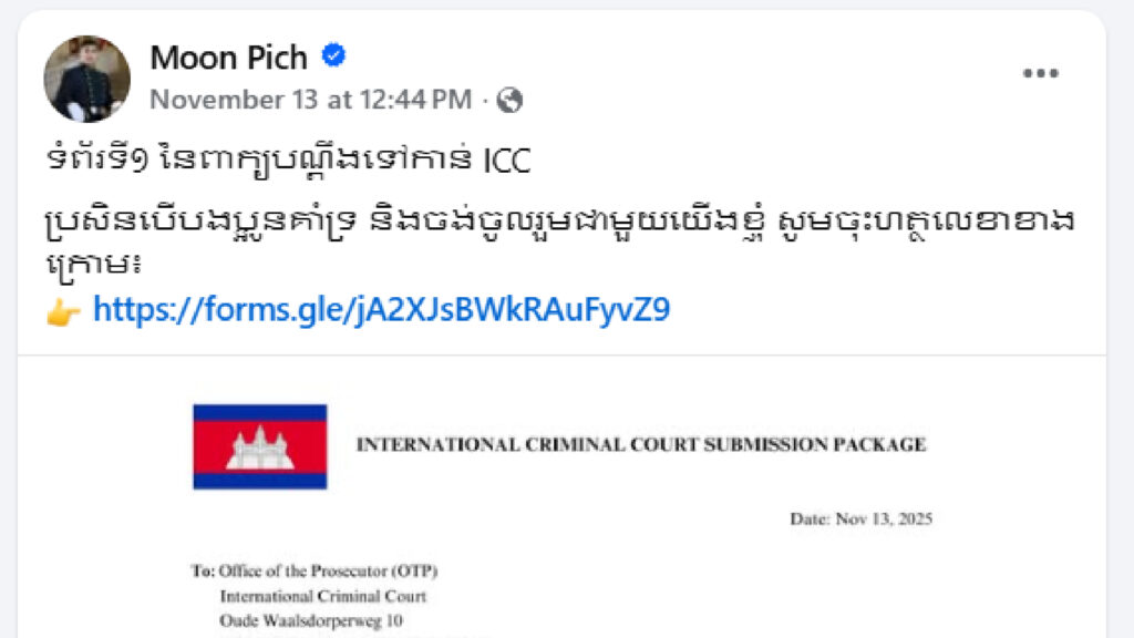 យុវជនកម្ពុជាមួយរូបគឺលោក មូន ពេជ្រ បានប្រើប្រាស់បណ្ដាញសង្គមរបស់លោក ផ្ដួចផ្ដើមកៀរគរមតិគាំទ្រពីប្រជាពលរដ្ឋខ្មែរ ដើម្បីដាក់ពាក្យប្ដឹង ប្រឆាំងនឹងពួកមេដឹកនាំយោធា និងអ្នកដឹកនាំនយោបាយថៃ ទៅកាន់តុលាការព្រហ្មទណ្ឌអន្តរជាតិ (ICC) ជាស្ថាពរ។