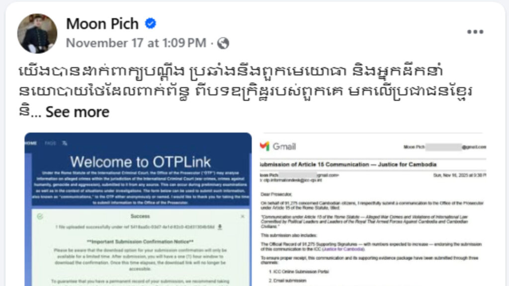 យុវជនកម្ពុជាដែលបញ្ចប់ការសិក្សាផ្នែកយោធានៅសហរដ្ឋអាមេរិក លោក មូន ពេជ្រ បានដាក់ពាក្យប្ដឹងពួកមេដឹកនាំយោធា និងអ្នកដឹកនាំនយោបាយថៃ ទៅកាន់តុលាការព្រហ្មទណ្ឌអន្តរជាតិ (ICC) ដោយចោទប្រកាន់ពាក់ព័ន្ធពីបទឧក្រិដ្ឋរបស់ពួកគេមកលើប្រជាជនខ្មែរ និងប្រទេសកម្ពុជា ជាមួយនឹងស្នាមមេដៃគាំទ្រពីប្រជាពលរដ្ឋខ្មែរជាង ៩ម៉ឺននាក់ គិតត្រឹមថ្ងៃទី១៧ វិច្ឆិកា។