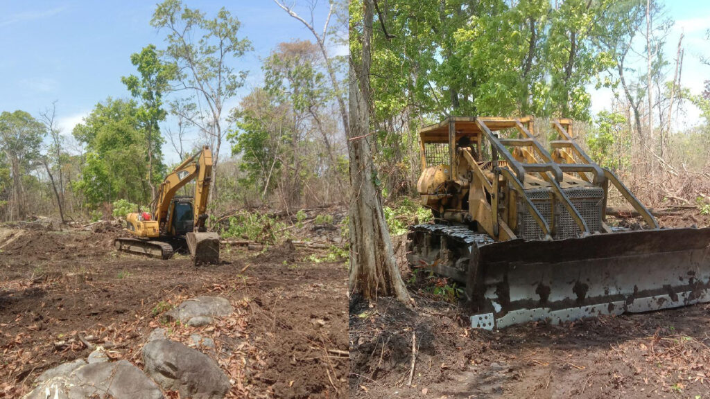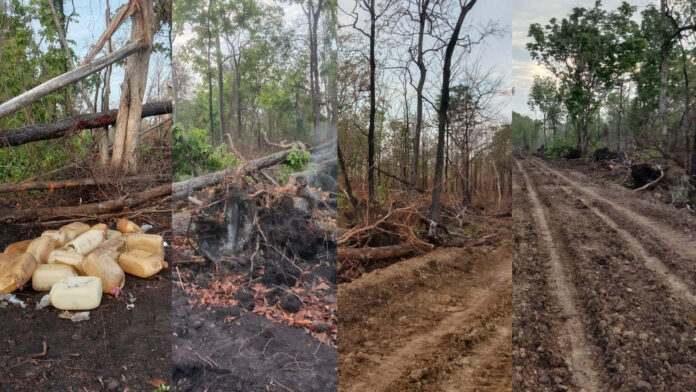 ក្រុមហ៊ុនវៀតណាម ឈូសឆាយដីព្រៃសហគមន៍សំពុង ស្ថិនក្នុងឃុំកោះខ្ញែរ ស្រុកសំបូរ ខេត្តក្រចេះ កាលពីថ្ងៃទី០៦ ខែមីនា ឆ្នាំ២០២៦។ រូបថតពលរដ្ឋផ្ដល់ឲ្យ