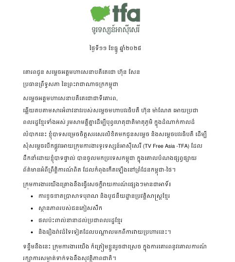 នាយកប្រតិបត្តិនៃទូរទស្សន៍អាស៊ីសេរី លោក ជុន ច័ន្ទបុត្រ បានសរសេរលិខិតពីរច្បាប់ដាក់ជូនលោក ហ៊ុន សែន និងលោក ហ៊ុន ម៉ាណែត ដើម្បីស្នើសុំឲ្យលោកទាំងពីរ បើកផ្លូវឲ្យក្រុមការងារទូរទស្សន៍អាស៊ីសេរី បានចូលទៅប្រទេសកម្ពុជា ក្នុងគោលបំណងផ្សព្វផ្សាយព័ត៌មានអំពីព្រឹត្តិការណ៍ពិតដែលកំពុងកើតឡើងនៅព្រំដែនកម្ពុជា-ថៃ។