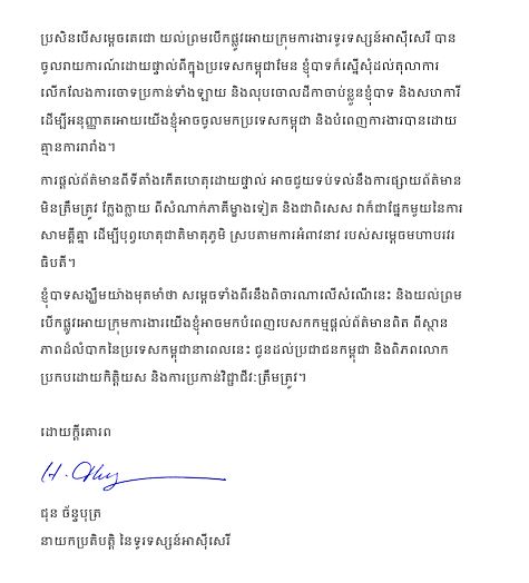 លិខិតនេះ យើងបានបញ្ជូនដល់ដៃលោក ហ៊ុន សែន ហើយ តាមរយៈអ្នកនាំពាក្យលោក ហ៊ុន សែន និងអ្នកនាំពាក្យគណបក្សប្រជាជនកម្ពុជា ប៉ុន្តែយើងបានទទួលចម្លើយអវិជ្ជមានពីលោកហ៊ុន សែន។