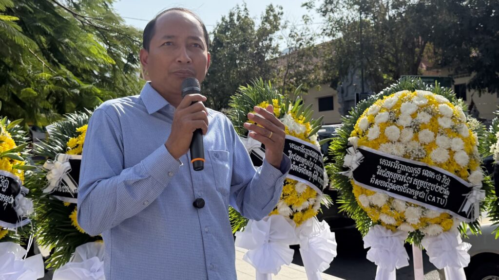 អនុប្រធាន​សហព័ន្ធ​សហជីព​ប្រជាធិបតេយ្យ​កម្មករ​កាត់​ដេរ​កម្ពុជា (​ស៊ីខៅឌូ​) លោក អាត់ ធន់ ថ្លែងក្នុង​ពិធីរំលឹប​ខួប ២២ឆ្នាំ​របស់​លោក ជា វិជ្ជា ​កាលពីថ្ងៃទី២២ មករា ២០២៦។ រូប៖ ពលរដ្ឋផ្ដល់ឱ្យ