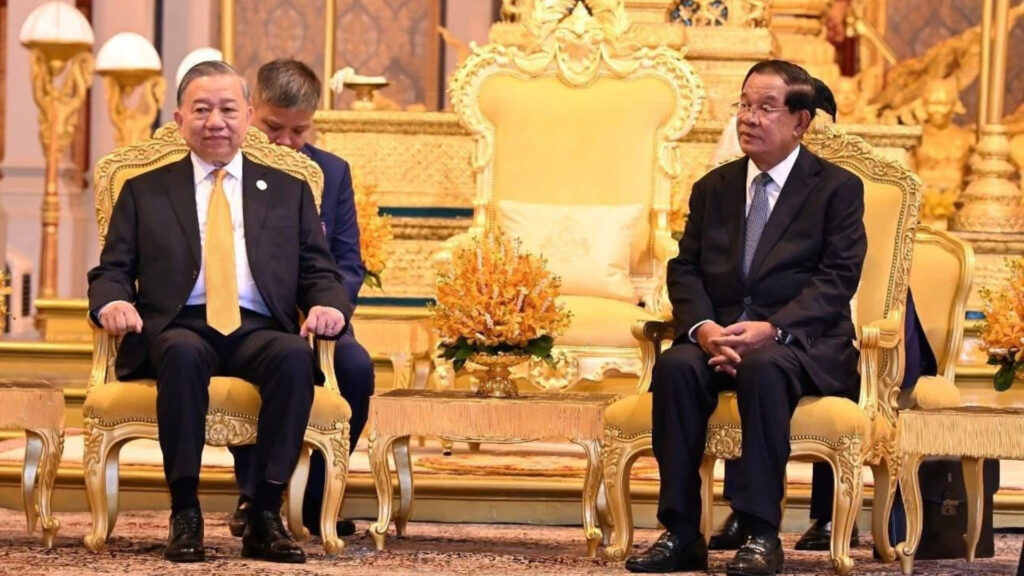 ប្រធានព្រឺទ្ធសភា លោក ហ៊ុន សែន (ស្ដាំ) ទទួល​អគ្គលេខាធិការ​បក្ស​កុម្មុយនិស្ត​វៀតណាម លោក តូ ឡឹម (To Lam) នៅក្នុងព្រះបរមរាជវាំង កាលពី​ថ្ងៃទី៦ ខែមករា ឆ្នាំ​២០២៦។ រូប៖ ហ្វេសប៊ុកលោក ហ៊ុន សែន