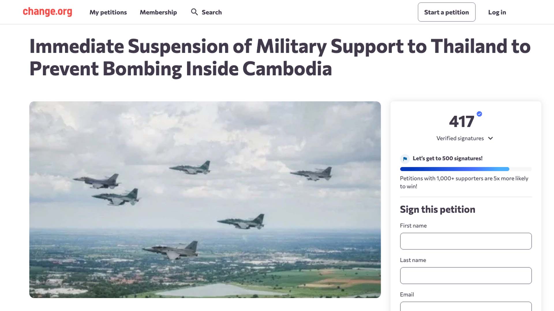 ញត្តិអំពាវនាវរបស់ចលនាខ្មែរដើម្បីប្រជាធិបតេយ្យ កាលពីថ្ងៃទី២៤ ខែធ្នូ ឲ្យដឹងថា រដ្ឋអ៊ីស្រាអែលក្នុងឆ្នាំ២០២៥ បានផ្គត់ផ្គង់ប្រព័ន្ធការពារដែនអាកាស និងមីស៊ីល Barak MX មានតម្លៃប្រហែល១០៧លានដុល្លារអាមេរិកដល់ប្រទេសថៃ រីឯ ប្រទេសស៊ុយអែតក្នុងឆ្នាំ២០២៤ បានផ្ដល់ឲ្យថៃ នូវយន្តហោះចម្បាំង Saab Gripen E/F ចំនួនបួនគ្រឿង ដែលមានតម្លៃប្រមាណ ៦០០លានដុល្លារអាមេរិក ។ ចលនាខ្មែរដើម្បីប្រជាធិបតេយ្យ ឲ្យដឹងដែរថា សហរដ្ឋអាមេរិក ចាប់ពីឆ្នាំ២០០០ មក បានអនុញ្ញាតឲ្យប្រទេសថៃធ្វើប្រតិបត្តិការយន្តហោះចម្បាំង F-16 ក្រោមកម្ម វិធីលក់សព្វាវុធដល់យោធាបរទេស រួមទាំងឧទ្ធម្ភាគចក្រប្រយុទ្ធចំនួន១៦ គ្រឿង ដែលមានតម្លៃ១៣៦លានដុល្លារអាមេរិក បូករួមទាំងការធ្វើបច្ចុប្បន្នកម្ម និងការ គាំទ្រជាប្រចាំរាប់ទសវត្សរ៍តទៅមុខទៀត។