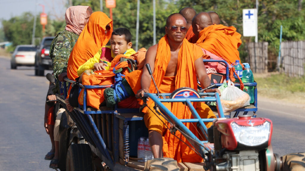 ព្រះសង្ឃ​​និង​ពលរដ្ឋ​ភៀស​សឹក​បើក​គោយន្ត​​ជម្លៀស​ពី​ការ​ឈ្លានពាន​របស់​យោធា​ថៃ នៅ​ថ្ងៃទី​១០ ធ្នូ ២០២៥។ រូប៖ ហ្វេសប៊ុក​លោក នេត្រ ភក្ត្រា