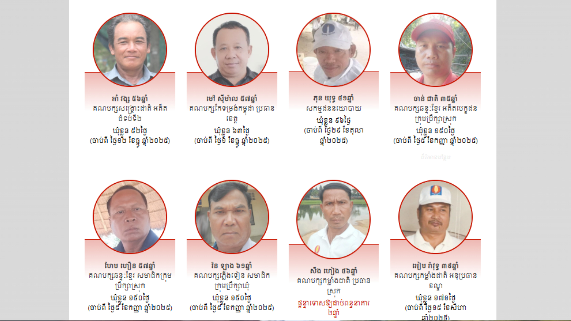 អង្គការការពារសិទ្ធិមនុស្សលីកាដូ (Licadho) រាយការណ៍នៅថ្ងៃទី៣០ ខែមករាថា សមាជិកសកម្មនៃគណបក្សប្រឆាំងទាំងនោះ រួមមាន លោក ហែម ហឿន សមាជិកក្រុមប្រឹក្សាស្រុកឱរ៉ាល់ និងជាប្រធានប្រតិបត្តិគណបក្សឆន្ទៈខ្មែរ ស្រុកឱរ៉ាល់ ខេត្តកំពង់ស្ពឺ លោក វ៉ន ឡាង ជាជំទប់ទី២ ឃុំត្រពាំងជោរ និងជាប្រធានប្រតិបត្តិគណបក្សភ្លើងទៀន ស្រុកឱរ៉ាល់ ខេត្តកំពង់ស្ពឺ លោក ឡេង ឡុន ជាអនុប្រធានប្រតិបត្តិថ្នាក់ស្រុកស្ទោង នៃគណបក្សកម្លាំងជាតិ ខេត្តកំពង់ធំ។ រីឯ សកម្មជនបក្សប្រឆាំង ៣នាក់ទៀត គឺលោក ម៉ុង ផល្លី លោក ប៉ក់ ស៊ីណាវុធ និងលោក សៀវ ចាន់រ៉ុម។