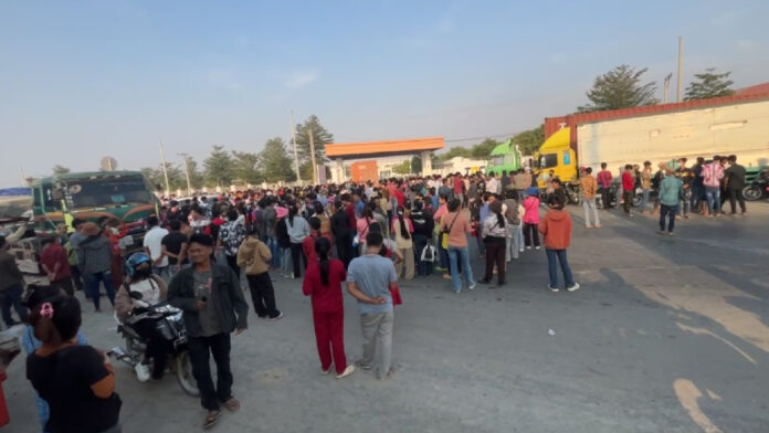​ទិដ្ឋភាពកម្មករ​រោងចក្រ ត្រាយ​អាំហ្វិន ដ្រេហ្គន (Triumphant Dragon Cambodia) ជាង​២​ពាន់​នាក់ ប្រមូលផ្ដុំ​គ្នា​តវ៉ា​បិទ​កំណាត់​ផ្លូវជាតិ​លេខ​៣ កាលពីថ្ងៃទី២៦ ខែ​មករា ឆ្នាំ​២០២៦។ រូប៖ បណ្ដាញសង្គម