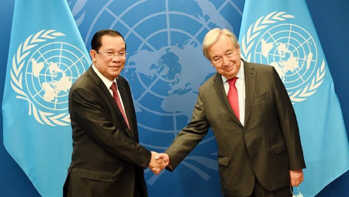 អតីត​នាយករដ្ឋមន្ត្រី លោក ហ៊ុន សែន (ឆ្វេង) ជួប​អគ្គលេខាធិការ​អង្គការ​សហប្រជាជាតិ លោក អង់តូនីញ៉ូ ហ្គូទែរ៉េ (António Guterres) នៅ​ទីស្នាក់ការ​អង្គការ​សហប្រជាជាតិ កាល​ពី​ថ្ងៃទី២២ កញ្ញា ២០២៥។ រូប៖ គេហទំព័រ CPP