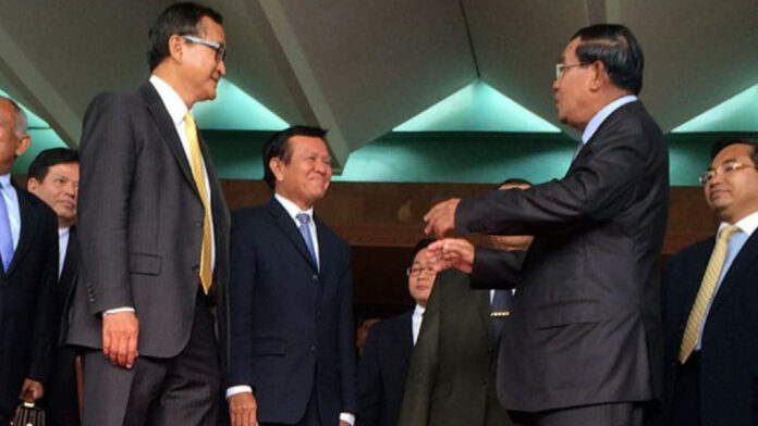 លោក សម រង្ស៊ី (ឆ្វេង) និង​លោក កឹម សុខា (កណ្ដាល) ជជែក​ជាមួយ​លោក ហ៊ុន សែន ក្រោយ​ចេញ​ពី​ជំនួប​ប្រជុំ​កំពូល​កាល​ពី​ថ្ងៃ​ទី​២២ កក្កដា ២០១៤ នា​វិមាន​ព្រឹទ្ធ​សភា។ RFA/Tin Zakariya