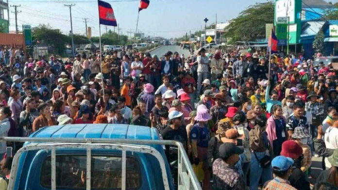 ទិដ្ឋភាព​កម្មករ​រោងចក្រ​យីហោ YJC បាន​តវ៉ា​បិទ​កំណាត់​ផ្លូវជាតិ​លេខ​៣ ស្ថិតនៅ​ក្នុងភូមិ​ធ្លក ឃុំ​ជង្រុក ស្រុក​គងពិសី ខេត្តកំពង់ស្ពឺ កាល​ពី​ថ្ងៃទី៧ ខែ​មករា ឆ្នាំ​២០២៦។ រូប៖ កាសែត​កោះសន្តិភាព